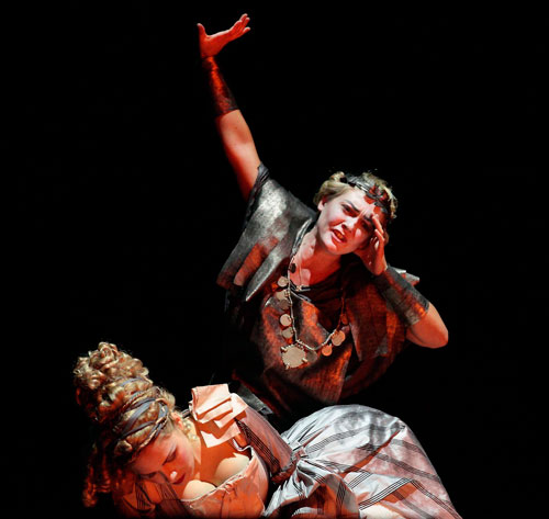 За театральную часть оперы отвечали постановщик Данила Ведерников, продумавший сложную систему жестов у певиц, и немецкий знаток старинных танцев Клаус Абромайт, вместе с руководимым им «Барочным балетом Анджолини» представивший изысканные танцевальные па в стиле картин рококо. Кутюрье Лариса Погорецкая одела героев в костюмы и платья с кринолином по моде XVIII века, делавшие героев похожими на изящные фарфоровые статуэтки. Все действо происходило без единого намека на какие-либо декорации в совершенно пустом пространстве сцены Эрмитажного театра, где на темном фоне прожектор высвечивал персонажей. Это было, пожалуй, главным визуальным минусом «премьеры реконструкции».