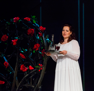 Молодой режиссер Василий Заржецкий вместе с художником-постановщиком Юлией Гольцовой показали свои размышления на тему последнего оперного шедевра Чайковского сквозь призму интертекстуальности: нашлось место и сказочности, и скептицизму в адрес пыльной хрестоматийной оптики, и наивности, и отрезвляющему горькому пессимизму. В антракте, когда на занавесе проявились контуры картины, возможно, Данте Габриэля Россетти, стало известно и еще об одном красивом намерении постановщиков связать символизм «Иоланты» с эстетикой прерафаэлитов. Но в сценическую ткань спектакля им удалось вписать лишь два розовых куста с большими шипами – белый и красный. Они выросли словно бы для того, чтобы и самим постановщикам, и вслед за ними слушателям «продираться» к глубинным смыслам этой самой загадочной и мистической оперы Чайковского. Когда Водемон с Иолантой касались этих кустов, в зале ждали, что кто-то непременно наколется и прольется кровь, но все осталось неповрежденным. Впрочем, эта сцена запомнилась как одна из самых удачных и выразительных.
