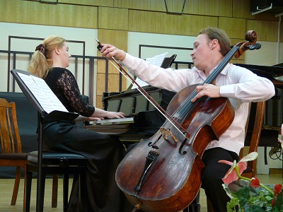 В годы учения у Шостаковича Хачатурян создал скрипичную сонату, которая с большим успехом прозвучала в Праге в 1947 году в исполнении Л. Когана. Мастер признался, что считает это сочинение своим первым из значимых. В тот творческий вечер мы услышали ее в исполнении аспиранта МГК им. П.И. Чайковского И.Покровского (скрипка) и студента МГИМ им. А.Г. Шнитке С.Серебрянникова (фортепиано). Вторым номером прозвучал виолончельный концерт в исполнении Романа Ефимова (виолончель) и Нины Евграфовой (фортепиано). Если о сонате Карэн Суренович сказал – «вот, с чего я начинался», то концерт представил так: «Это то, до чего я дошел». Да, юмор и скромность не покидают его ни в обычной жизни, ни на сцене!