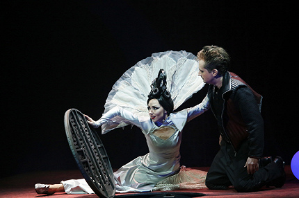 В противовес драматургической концепции выглядит эта «Турандот» вполне традиционно – красивая сказка, ориентальное шоу, добротный, крепкий, визуально привлекательный спектакль. Чудесны костюмы канадской китаянки Камелии Куу, изобретательны ее же легкие, ажурные декорации-сетки, в нужный момент оказывающиеся тюремными решетками. Мастерски сделан свет (Томас Хазе), созданная видеографикой Луна – символ Турандот – зачаровывает красивым мерным свечением, а еще – мгновенным преображением в несущий смерть острый крутящийся диск-нож. В геликоновской «Турандот» населяющие оперу китайцы видят то, что всем другим смертным видеть заказано, – обратную сторону «небожительницы»: и если она сама не разочаровывает, то оборотная сторона принцессы ужасает. Танцовщица (Ксения Лисанская) олицетворяет прекрасный холодный образ, в то время как певица (Елена Михайленко) – ужасную кровожадную суть. Такое раздвоение личности объясняет чары, которым поддался Калаф.