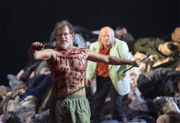 Именно с этой «горы», раскидывая в разные стороны оторванные руки и ноги, спускается ближе к завершению оперы Моисей (британский бас-баритон Роберт Хэйворд). В первом акте одетый, словно провинциальный фокусник начала XX века – в круглых «фрейдовских» очках, шляпе-цилиндре, во фраке с тросточкой, – в финале он появляется в нелепых семейных трусах и с изувеченным кровавыми рубцами голым торсом, на котором вырезаны те самые десять заповедей. Не выдержав тяжести увиденной им картины, Моисей разбивает «скрижали», вонзая в себя нож. Последнее, что произносит герой: «О Слово, ты Слово, которого мне не хватает», – его прощание с мечтой, или навязчивой идеей силой убеждения изменить этот мир в лучшую сторону. Мечта оказывается тщетной, и в последнем проведении серии, слегка намекнув на «тристановский мотив» Вагнера, Шёнберг схлопывает всю оркестровую ткань в выдержанный унисон фа-диез, ставя, таким образом, сам под сомнение всю свою идеально сконструированную теоретическую систему.