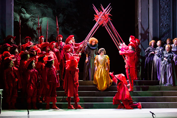 Театральный гардероб в монохромной гамме стилизован под соответствующую историческую эпоху, а пластика мизансцен современна и действенна. В чем-то «земля сценографии» и выросшие на ней «цветы одежд» героев (красные – «злые», черные – на сей раз «добрые», золотисто-желтые – специальные «цвета любви» Лючии и Эдгара) отсылают к идее постановки 2014 года на этой же сцене «Ромео и Джульетты» Гуно в режиссуре француза А. Бернара. Отыскать точки соприкосновения между французской лирической оперой и оперой итальянского бельканто при всем их отличии можно, так почему бы при схожести обеих генеральных коллизий не найтись также и точкам пересечения визуальных идей! Тогда архитектурой спектакля был модерн, а сейчас стал строгий, скупой классицизм.