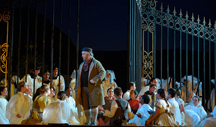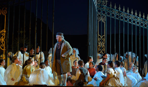 Решать непростую задачу пригласили знаменитого французского режиссера Николя Жоэля, чьи постановки сегодня украшают все ведущие сцены мира. Он явил режиссуру, редкую по нынешним временам – вовсе лишенную экстравагантных ходов, строящую спектакль в полном соответствии с авторскими ремарками Пуччини. Действие драмы разворачивается в Риме в 1800 году, о чем свидетельствуют огромная надпись на статичной, на весь спектакль, декорации – не то крепостной стене, не то виадуке (сценограф Эмманюэль Фавр) – и 16-метровый ангел с распростертыми крыльями, известный символ римского замка Сант-Анджело. Элегантные костюмы эпохи ампир (художник Катя Дюфло) усиливают видеоряд исторической драмы – у зрителя возникает иллюзия, что он погружается в гущу событий бурного наполеоновского времени. Проблему с циклопическим пространством Жоэлю лучше всего удается решить во втором и третьем актах. В первом же удачна лишь краткая массовая сцена (когда приходит весть о поражении Наполеона и «клерикалы» всех возрастов открыто радуются этому прямо в храме), а мизансцены Каварадосси и Анджелотти, Тоски и Каварадосси, Тоски и Скарпиа, где важны пресловутые нюансы, все-таки теряются и оказываются весьма невыразительными; кроме того, артистам постоянно приходится преодолевать гигантские расстояния – от алтаря церкви Сант-Андреа до капеллы Аттаванти в самом большом оперном театре будет всего несколько метров, здесь же подобная дистанция чревата солидной пробежкой. Во втором акте режиссер сильно ограничивает сценическое пространство, условно обозначая кабинет Скарпиа выгородкой из секстета кожаных казенных стульев, и это во многом решает проблему мизансценирования – несмотря на по-прежнему немалую дистанцию между зрителем и героями, внимание волей-неволей концентрируется на этом пятачке, и борения протагонистов получаются более рельефными. Третье, «расстрельное» действие как раз уже по сюжету предполагает некоторое пространство, «простор» тюремного двора, в котором прозвучит роковой для Тоски и Каварадосси залп.