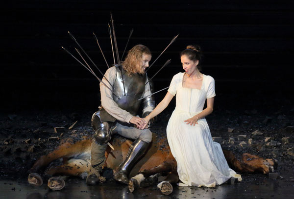Перед третьим актом обрюзгшие мужские фигуры также даны вверх ногами. И черные елки, и вигвам, сделанные из мягких складывающихся материалов, были подвешены к колосникам вверх ногами, словно Парсифаль вернулся в мир антиподов. Эта визуальная перверсия указывала на то, что мир уже не будет прежним; копье – в виде тонкого креста-шпаги – вернулось к кубку, Амфортас исцелен, а Кундри – рыжеволосая дикарка в первом акте и соблазнительная волоокая блондинка во втором – превратилась в скромную смиренную и бессловесную монашку с коротко остриженными каштановыми волосами.