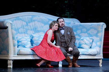 Это замкнутое пространство инверсно: оно – и практически пустой внутренний мир Виолетты, и внешняя многоликая вселенная светской жизни. Все зависит от конкретной картины и направленности перемещений на сцене. Извне вовнутрь или изнутри во внешний мир – неважно: важна смена планов, хотя эта смена при всей абстракции сценографии более чем иллюзорна. И тогда на помощь приходит огромных размеров диван с обивкой цвета летнего неба с облачками. Как только его видим, сразу понимаем: это и есть внутренний мир Виолетты – вся жизнь ее с Альфредом происходит на диване.