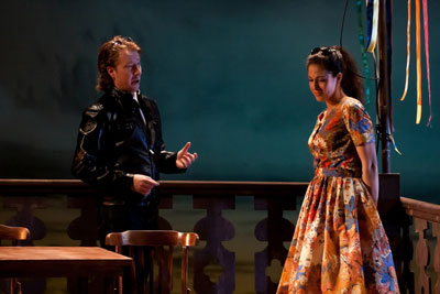 Заложенная в либретто и музыке вечная история любви и, конечно же, ее неизбежных мук помещается в атмосферу 50-70-х годов прошлого века. Эта эпоха при всей ее противоречивости и политической ангажированности, когда провозглашалось одно, а на деле происходило другое, морально-нравственные устои нашего общества были в гораздо большем почете, чем сегодня. И этот аспект, несмотря на чисто западную режиссерскую ментальность, проступает в постановке весьма отчетливо. Она во многом наивна, отчасти иллюстративно мила, а в деталях костюма и сценографии иногда даже гипертрофированно иронична, но в ней нет ни «клюквенности», ни какого-либо эпатажа. Новая работа несет в себе позитив доброжелательности, уважительности к «русскости», поэтому спектакль легко располагает к доверию.