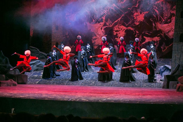 Большинство сцен выдержано в эстетике романтической плакатности, но ряд комбинированных абстрактных эпизодов-связок, в которых сквозное развитие достигается хореографическими средствами (либо батальные, либо дивертисментные включения), теперь выполняет в опере функции балетных pas d’action. Так что роль хореографа живо перекликается с ролью режиссера спектакля. Хор в нем поначалу даже принимаешь за миманс, ибо в предрассветной дымке зачина мужская хоровая группа джигитов в черкесках и бурках под звуки молитвы возникает словно из гор, а затем под бурками-«горками» превращается в «живые валуны». При этом функции хористок в национальных костюмах (платьях с богатой расшивкой серебром) вполне традиционны.