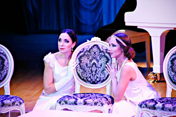 В отличие от партитуры Керубини в спектакле «Геликона» действующих лиц больше, чем четыре. Помимо солистов это еще танцовщица Ксения Лисанская (хореограф продукции), олицетворяющая прекрасную статую до ее оживления, а также играющие на фортепиано и клавесине Сергей Чечётко (музыкальный руководитель постановки) и Елена Сосульникова, активно включенные в сценическое действие и получившие даже имена в программке – Орфей и Орфея. Есть и еще новации – спектакль начинается фрагментом из совершенно другой оперы того же автора: исполнительница партии Венеры Инна Звеняцкая поет трагическую арию Медеи в мощном патетическом стиле. Впрочем, после стенобитной Турандот солистке, кажется, уже ничего не страшно.