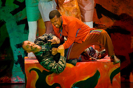 Неоконченная семи-опера в данной интерпретации была впервые показана осенью прошлого года в Перми и в Мадриде, теперь ее ожидает еще и лондонская премьера, поскольку постановка Питера Селларса – это копродукция уральского театра, мадридского Королевского театра и Английской национальной оперы. От своего прототипа, то есть оперы-маски Пёрселла, получившийся спектакль отстоит на значительном расстоянии: Курентзис и Селларс сделали новую редакцию, вплетя в ткань другую музыку композитора (его песни, церковные гимны), кроме того, полностью была пересмотрена драматургия, ибо авторами спектакля предложено абсолютно новое либретто, написанное на основе романа современной никарагуанской писательницы Розарио Агиляр «Затерянные хроники Terra Firma». Однако сюжетная канва, основная антитеза – те же, что и в оригинале: сшибка испанских конкистадоров и индейских туземцев в кровавые времена покорения Америки, любовь представительницы местного нобилитета к испанскому военачальнику, трудности и противоречия этого межрасового союза на фоне продолжающейся истребительной войны.