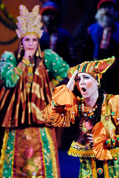 Певческое благополучие Украины с еще большим блеском было подтверждено в роскошном зале Киевской оперы: красивые, звучные голоса многочисленных солистов густонаселенной корсаковской оперы оставили отрадное впечатление. Особенно хотелось бы выделить звонкий, легко заполняющий зал тенор Дмитрия Кузьмина (Гвидон), изящную колоратуру Ольги Фомичевой (Лебедь), великолепные характерные работы Александра Дяченко (Старый дед) и Сергея Скубака (Скоморох), зычный баритон Александра Мельничука (Гонец). Свести воедино партитуру удается хрупкой женщине с железной волей – дирижерская палочка Аллы Москаленко блестяще «разруливает» сложную оперу, проводя ее динамично и выразительно.