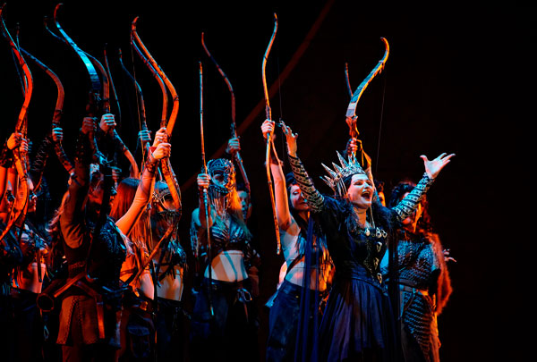 Для великой моцартовской оперы-загадки Фрай предложил яркое решение, прежде всего, увлекающее своим визуальным компонентом. Уже на звуках увертюры зритель видит развернутое во все зеркало сцены звездное небо, где среди астральных объектов извивается гигантский устрашающий змей – тот самый, от которого несколькими минутами позже будет убегать Тамино, которого победят Три дамы – фрейлины Царицы ночи и которого так испугается Папагено. Распахивается занавес, и мы удивляемся обворожительной картинке волшебных кущ. Дальше – больше. Повелительница тьмы выходит из ствола гигантского волшебного древа, а ее чертог охраняет громадная чудовищная рептилия. Ее воинство напоминает не то обитателей каменного века, не то амазонок, не то Робин Гудов раннего Средневековья. Злодеи-подельники Моностатоса – словно устрашающие орки, да и вообще перекличек со знаменитыми киносагами и компьютерными играми типа «Властелина колец» и «Игр престолов» в спектакле предостаточно. Насколько такие аллюзии уместны и конгруэнтны именно моцартовской музыке, стилистике зингшпиля, каждый зритель решает для себя сам, но в общем-то подобный подход воспринимается нормально, без отторжения.