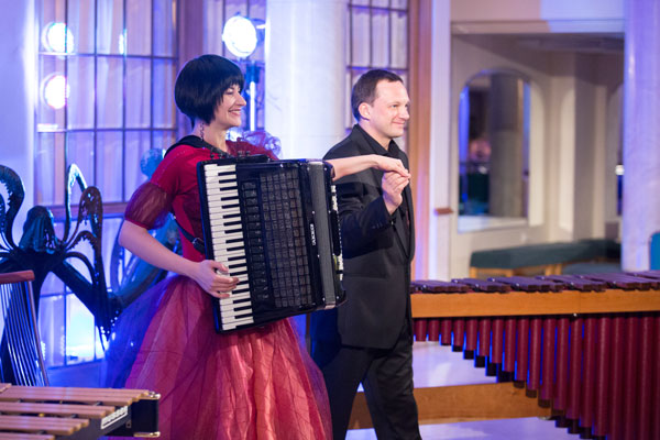 Зато у ансамблей-победителей – «Мирзоян-квартета» и дуэта «Витя+Маша=», разделивших I премию, с харизмой все было в порядке. Оба коллектива – находка для живущих ныне композиторов: они не только с готовностью исполняют современную музыку, но и придают тот шик, который позволяет ей успешно существовать на концертной эстраде. Высокопрофессиональный квартет – Арам Асатрян (первая скрипка), Сона Азарян (вторая скрипка), Армен Торосян (альт) и Ваган Григорян (виолончель) – был образован только в 2013 г., однако музыканты давно выступают вместе в составе российских и армянских оркестров и прекрасно чувствуют друг друга: их исполнение как темпераментный разговор, все участники которого высказываются в одно время, но при этом внимательно слушают друг друга и с уважением друг к другу относятся. Инструментальный дуэт «Витя+Маша=», состоящий из ударника Виктора Сыча и аккордеонистки Марии Власовой, обладает большим репертуаром современной музыки: для музыкантов писали и посвящали произведения Е. Подгайц, М. Броннер, Т. Сергеева, А. Коппел, Н. Мндоянц, Т. Шатковская-Айзенберг (исполняя произведение последней, М. Власова уже стала лауреатом первого конкурса «Композитор XXI века»). Токката для аккордеона и вибрафона Андерса Коппела, исполненная на гала-концерте, стала самым захватывающим номером вечера – особенно поражает умение музыкантов мгновенно переключаться из огненной виртуозности в лирические тона, всегда отаваясь убедительными.