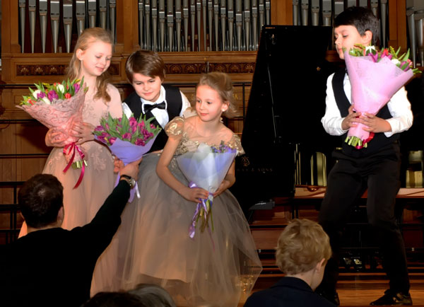 После выступления коллективов особенно трогательно на сцене этого великого зала прозвучал фортепианный ансамбль самых юных учеников школы в составе: Дима Бабаев, Кира Гаек, Григорий Кузнецов, Алина Бурмистрова. Их подготовила ведущий преподаватель школы, заслуженный работник культуры РФ Ида Сергеевна Локоткова.