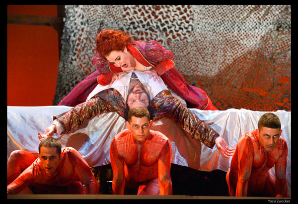 Певцы Идит Замир (сопрано) и Гая Манхейма (тенор) продемонстрировали ту самую выразительность и в пении, и в игре, без которой опера подобного плана просто немыслима. Было что-то магически-сказочное во всей обстановке: старинный костюм у героини (ну прямо испанская королева), кипа и жилетка у героя. Между ними сновали три актера миманса в костюмах, изображающих голое тело: обозначенные красными оттенками мускулы (чем не необходимый в опере общий план?..) Они – вроде бы слуги Госпожи, а может, ее погибшие (убитые?) мужья – амплитуда толкований широкая. Подобная неоднозначность и в отношении всего содержания. Отчего умерла героиня, почему так и не смогла убить героя? И почему он, столько раз уличавший ее во лжи, не бежал от нее? Страсть? Боязнь одиночества или извечная тяга жертвы к хищнику? Но как искренне отчаянье хищницы – сцена со вспарыванием ножом подушек. Эффектный, подводящий к кульминации оркестровый антракт. Во всех этих смысловых многоточиях музыка, как это всегда происходит в опере, – на стороне героев, потому и сопереживаешь им, потому и воспринимается весь спектакль на одном дыхании.