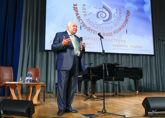 Первое заседание клуба прошло в очень теплой атмосфере – в беседу с композиторами включились не только взрослые, но и дети, активно задававшие вопросы. Владислав Казенин – автор музыки более чем к тридцати фильмам, а также к театральным спектаклям, нескольким опереттам и мюзиклам – рассказал о начале своего пути в кинематографе, о сотрудничестве со многими кинорежиссерами и о своих любимых фильмах. Не осталось в стороне и творчество коллег: «В последние годы появились замечательные оперы у Ширвани Чалаева, Александра Чайковского, Родиона Щедрина, которые, к сожалению, не известны широкому зрителю. На мой взгляд, хоровая опера Р. Щедрина “Боярыня Морозова” или “Пена дней” Э. Денисова – это уникальные произведения искусства». На вопрос о любимом собственном произведении В.И. Казенин ответил цитатой: «Как говорил Микаэл Таривердиев, “мое самое любимое произведение еще не написано”. А вообще надо любить то, над чем работаешь. У меня есть три фортепианных концерта, сейчас я сочиняю четвертый, и поэтому больше всего люблю его». Всю встречу композитор провел за роялем, сопровождая свой рассказ яркими музыкальными номерами – песнями из своих кино- и мультипликационных фильмов, исполненными совместно с народным артистом России Валерием Алиевым (баритон) и Екатериной Барбашовой (сопрано). Музыка В.И. Казенина прозвучала также в интерпретации учащихся ДШИ г. Видное Александра Вереженко (преподаватель Н.Н. Белозор), Эмилии Баруа (преподаватель Т.А. Егорова), преподавателя школы, лауреата всероссийских конкурсов Арины Сигитовой (сопрано) и концертмейстера Натальи Казарьян.