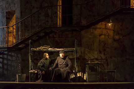 В постановочную команду спектакля Александра Тителя вошли дирижер Михаэль Гютлер, художник Владимир Арефьев, художник по свету Евгений Виноградов и хормейстер Эльвира Гайфуллина. Благодаря их совместным усилиям все в этой работе подчинено выдвижению на первый план трагедии личности и драмы хотя и обездоленного, но живого и по-настоящему активного социума. Клокотание вечного нерва истории вне пространства и времени в постановочную ткань спектакля вписывается на редкость органично, пусть для этого и привлекается целый арсенал эстетики театрального постмодернизма: визуальный ряд намеренно скуп, отчасти брутален, но при этом однозначно лишен какого-либо эпатажа. Единая на весь спектакль сценографическая конструкция – поворотный трансформер – напоминает то ли бункер, то ли склад-элеватор, то ли полубашню с окнами-дверями и спирально опоясывающими ее лестницами.