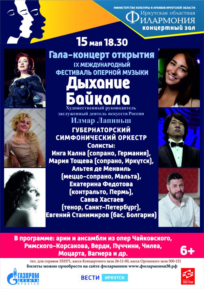 Международный фестиваль оперной музыки «Дыхание Байкала» проводится в Иркутске с 2011 г. Основной целью фестиваля является популяризация оперной музыки, а также поддержка молодых вокалистов. В этом году в Иркутской областной филармонии слушателей ждёт 5 дней оперного искусства.