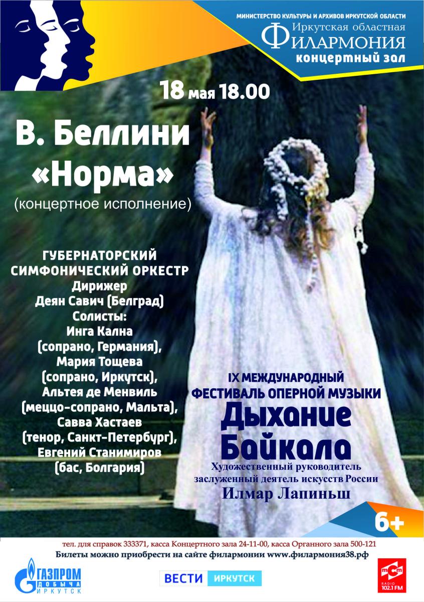 В четвёртый день фестиваля, 18 мая, прозвучит концертное исполнение оперы Винченцо Беллини «Норма». Губернаторским симфоническим оркестром будет дирижировать маэстро из Белграда Деян Савич. Солисты - зарубежные и российские оперные исполнители Инга Кална (Германия), Мария Тощева (Иркутск), Альтея де Менвиль (Мальта), Савва Хастаев (Санкт-Петербург), Евгений Станимиров (Болгария).