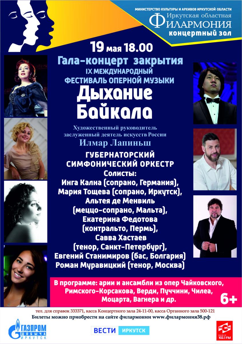 Закрытие фестиваля состоится 19 мая в Иркутской областной филармонии. На Гала-концерте солисты и Губернаторский симфонический оркестр под управлением Илмара Лапиньша исполнят арии и ансамбли из опер Чайковского, Римского-Корсакова, Верди, Пуччини, Моцарта, Вагнера и других композиторов.