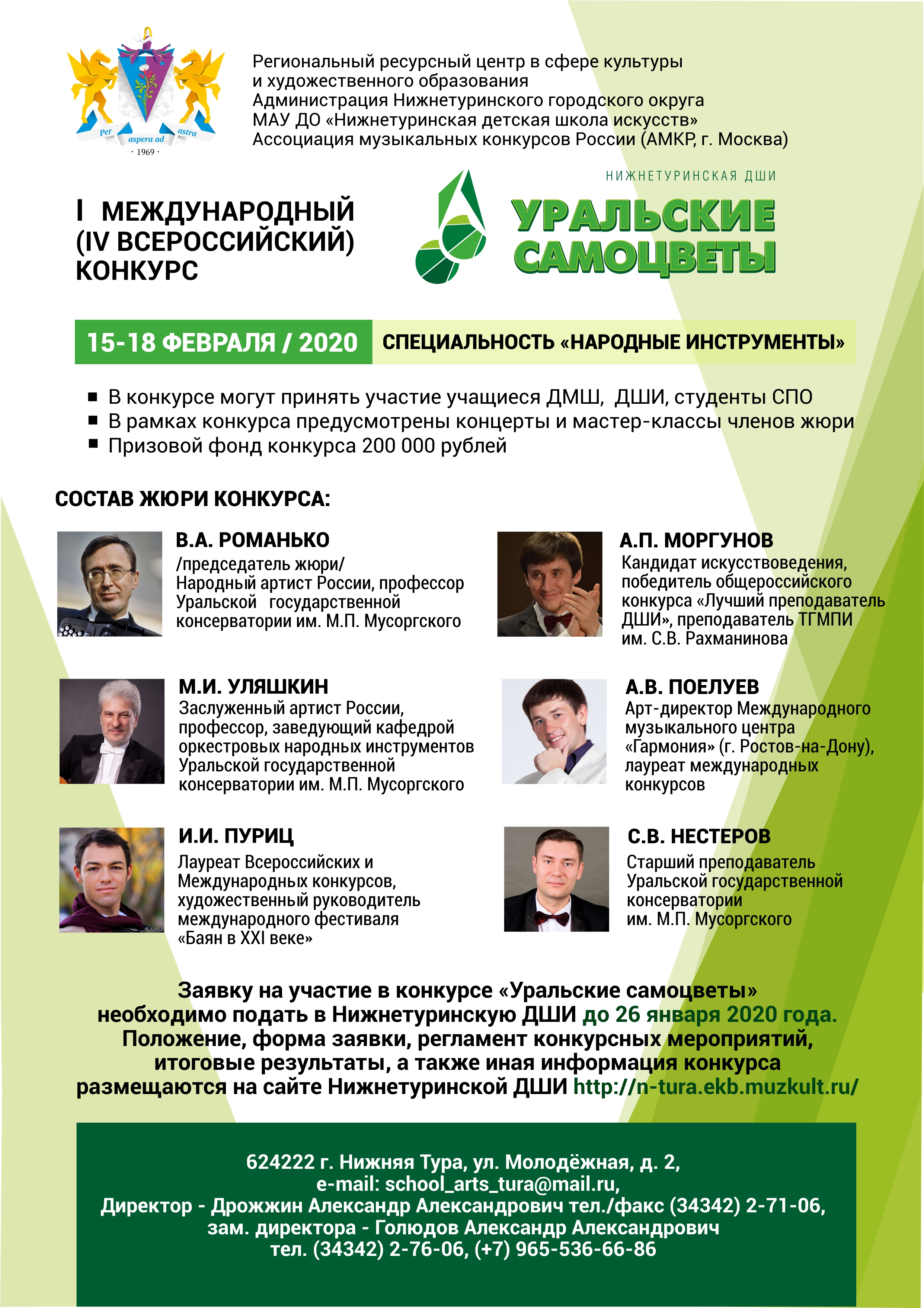 Результаты отборочного прослушивания объявляются 31 января и размещаются на сайте Нижнетуринской ДШИ ( https://n-tura.ekb.muzkult.ru/uralskiesamozvety ).