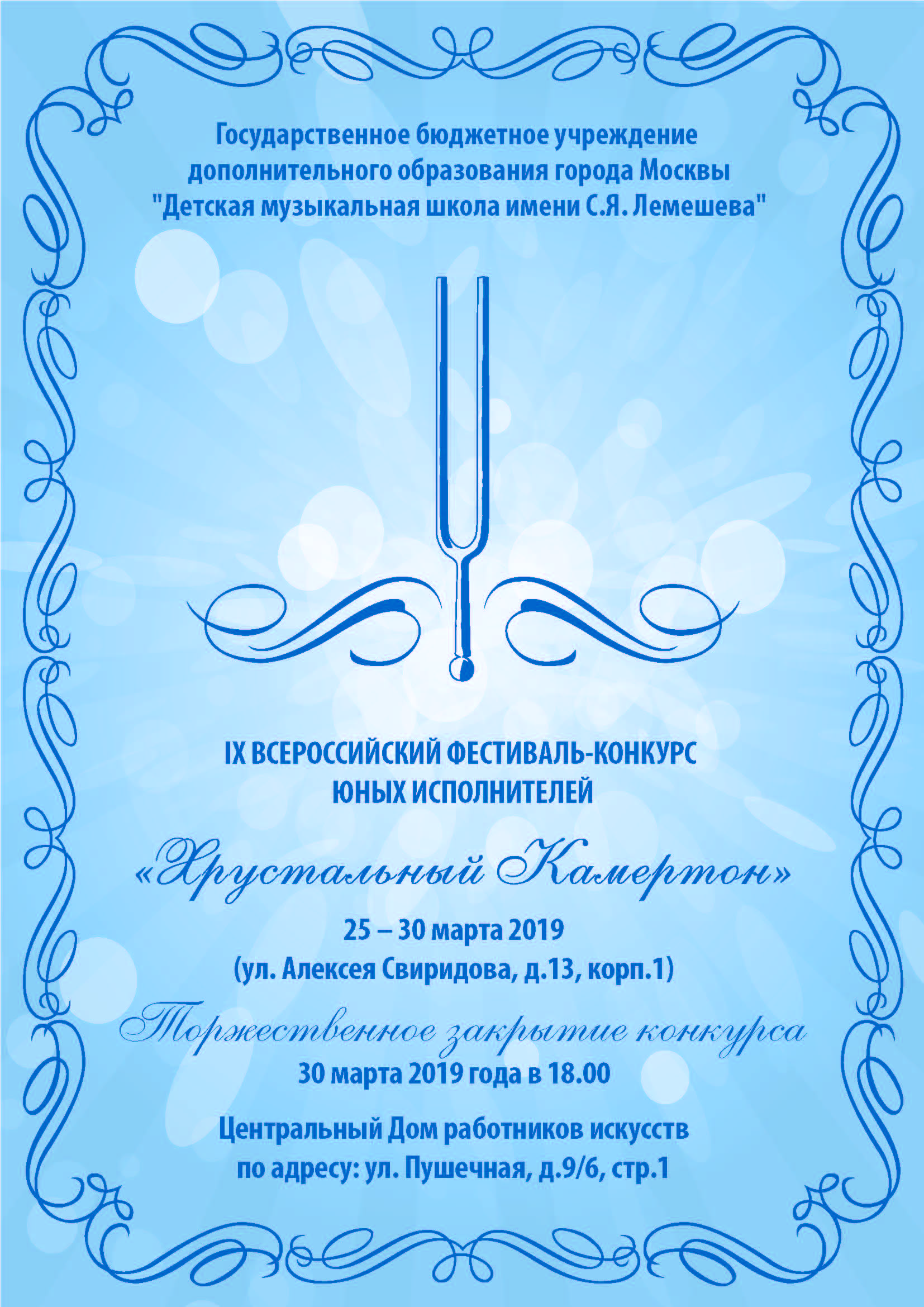 Конкурс проводится с 25 по 30 марта 2019 года в концертном зале ГБУДО г. Москвы "ДМШ им. С.Я. Лемешева".