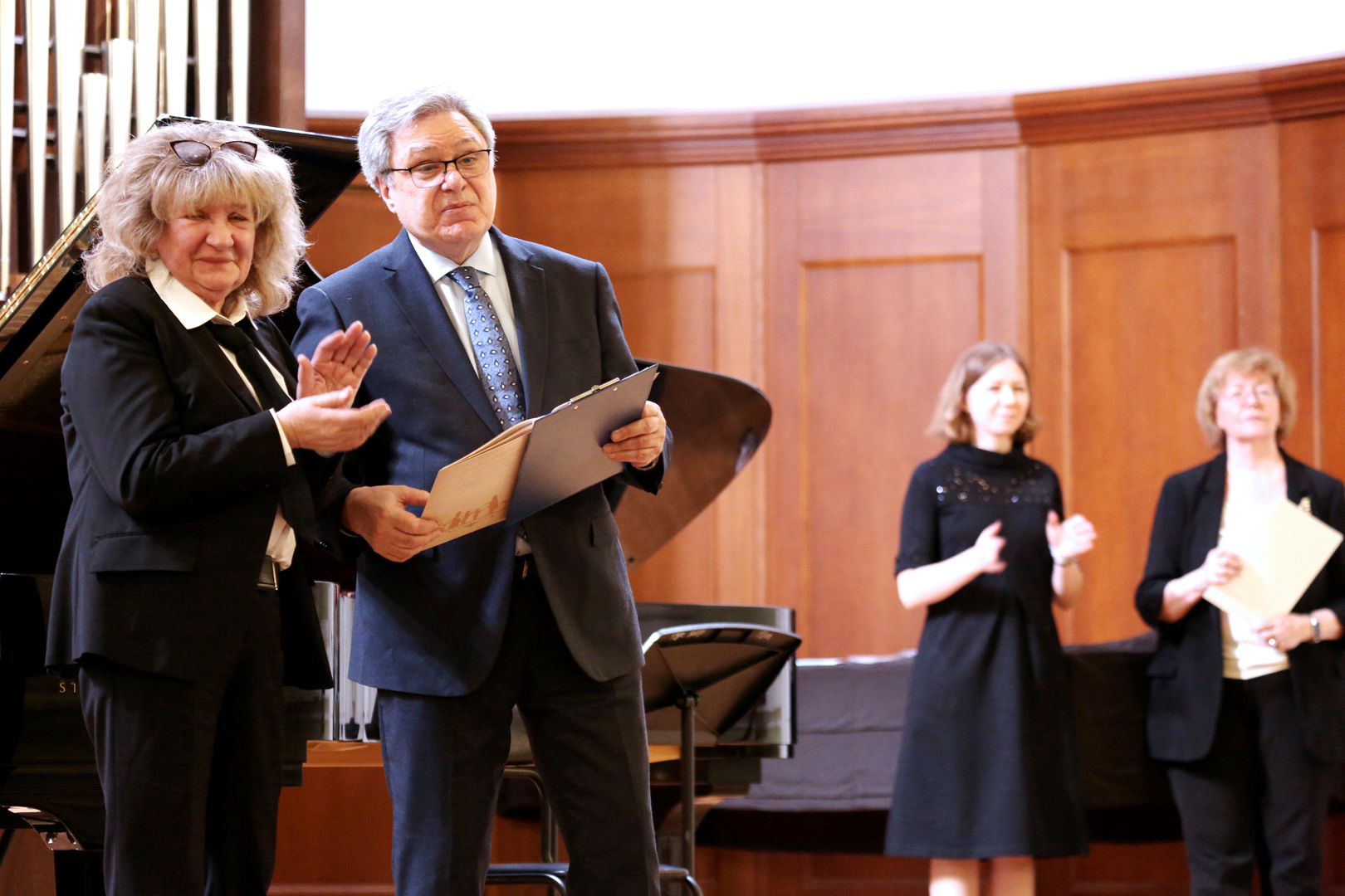Председатель жюри Олимпиады: кандидат искусствоведения, доктор педагогических наук, профессор, советник ректора Московской государственной консерватории имени П.И. Чайковского Л.Е. Слуцкая.