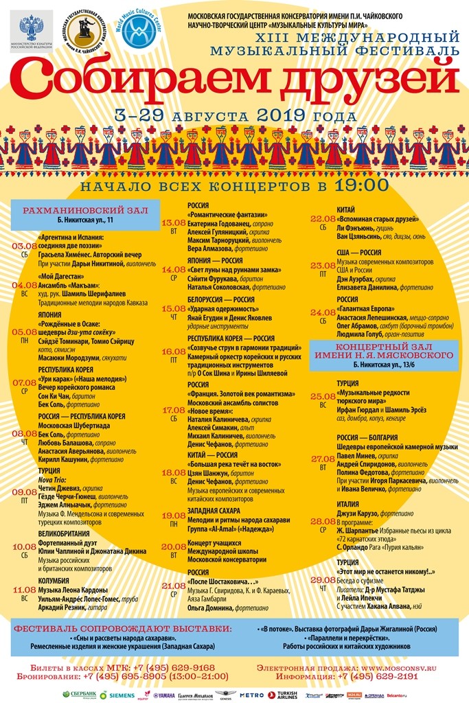 В этом году на 24 - х его концертах в Рахманиновском зале и Концертном зале им. Н. Я. Мясковского выступят музыканты из Аргентины, Беларуси, Болгарии, Великобритании, Западной Сахары, Италии, Китая, Колумбии, Республики Кореи, США, Турции, Японии и России. Своей кульминации фестиваль достигнет 20 августа, когда состоится традиционный концерт учащихся консерваторской Международной летней школы. Завершит «собрание друзей» встреча с турецкими исследователями загадочной суфийской традиции и концертом, главный «героем» которого станет кавказско - азиатский инструмент нэй, появившийся еще до нашей эры.