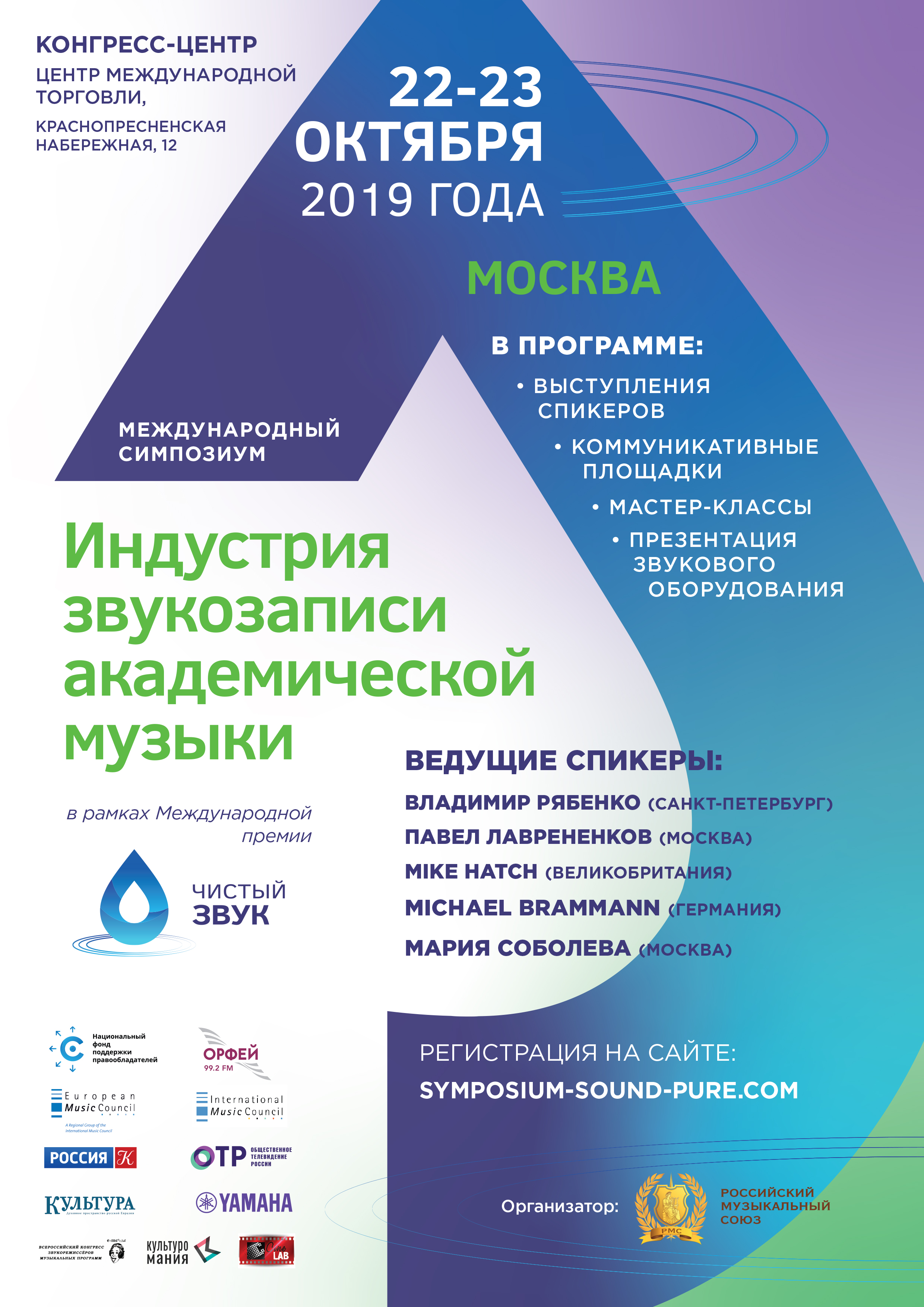 В числе спикеров симпозиума – ведущий звукорежиссер Мариинского театра Владимир Рябенко, начальник службы звукозаписи Московской филармонии Павел Лаврененков, профессор, председатель Гильдии звукорежиссеров Российского музыкального союза Мария Соболева, основатель звукозаписывающей компании Floating Earth Ltd Майк Хэтч (Великобритания), звукорежиссер компаний Teldec, Warner Classics, Sony Михаэль Бремменн (Германия).