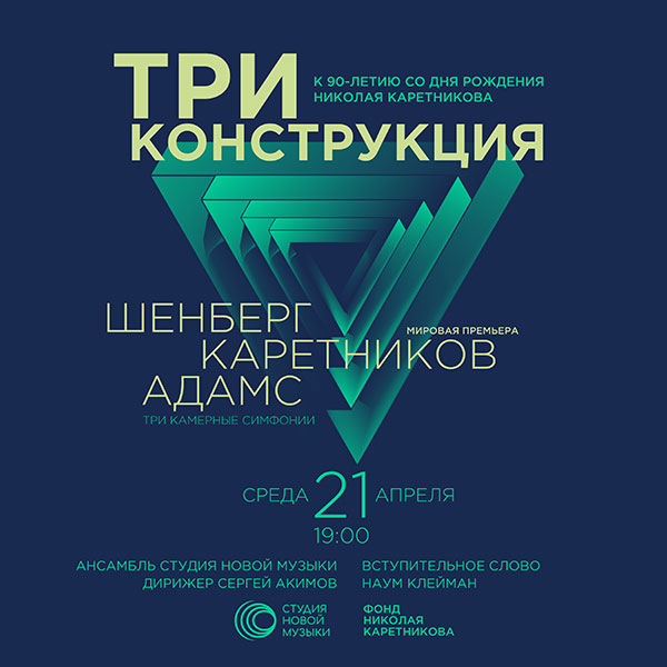 Последнее сочинение композитора (опус 32, 1994, посмертный), оказавшееся и последней российской камерной симфонией ХХ века, представят ансамбль «Студия новой музыки» и Фонд Николая Каретникова. Премьера пройдет под управлением Сергея Акимова в рамках концерта «Триконструкция». Оркестровку последней части по авторскому дирекциону завершил дирижер и пропагандист новой музыки Игорь Блажков. Вступительное слово о композиторе - историк кино и культуролог Наум Клейман.