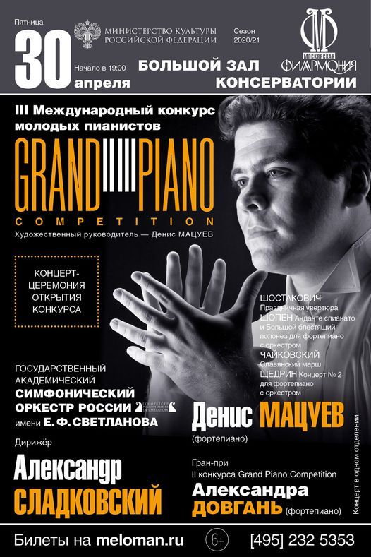 Торжественное открытие Grand Piano Competition состоится 30 апреля в Большом зале Московской консерватории. В концерте примут участие Денис Мацуев, первая победительница конкурса Александра Довгань и Госоркестр имени Е. Ф. Светланова под управлением Александра Сладковского (этот же коллектив будет работать с конкурсантами во втором туре). В программе вечера - сочинения Шостаковича, Шопена, Щедрина и Чайковского.