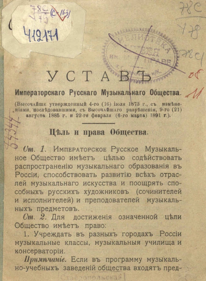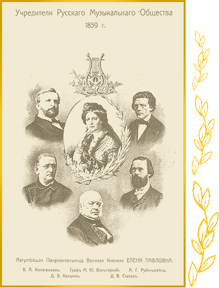 «Русское музыкальное общество» было основано в Санкт-Петербурге в 1859 году по инициативе Великой княгини Елены Павловны, композитора, пианиста А.Г. Рубинштейна и других музыкально-общественных деятелей, и просуществовало до 1917 года. Централизованное музыкальное общество с главной дирекцией в Санкт-Петербурге, имевшее разветвленную сеть отделений в провинциальных городах России, сыграло решающую роль в развитии музыкальной культуры и организации профессионального музыкального образования в нашей стране. Под эгидой РМО строились консерватории, открывались музыкальные школы. Организация выступала объединяющей платформой для всех музыкантов - проводила концерты, вела издательскую деятельность, открывала библиотеки. В салоне Великой княгини в зале Михайловского дворца (ныне здание Русского музея), постоянно проходили концерты камерной музыки. Для симфонических концертов был избран зал Благородного собрания (ныне это здание Петербургской филармонии). Занятия студентов нового учебного заведения - консерватории - некоторое время проводились в боковом флигеле Михайловского дворца. Сегодня РМО возрождается с теми же целями: развитие общероссийской музыкальной культуры, популяризация классической музыки, поддержка молодых талантов и развитие музыкального менеджмента в России.