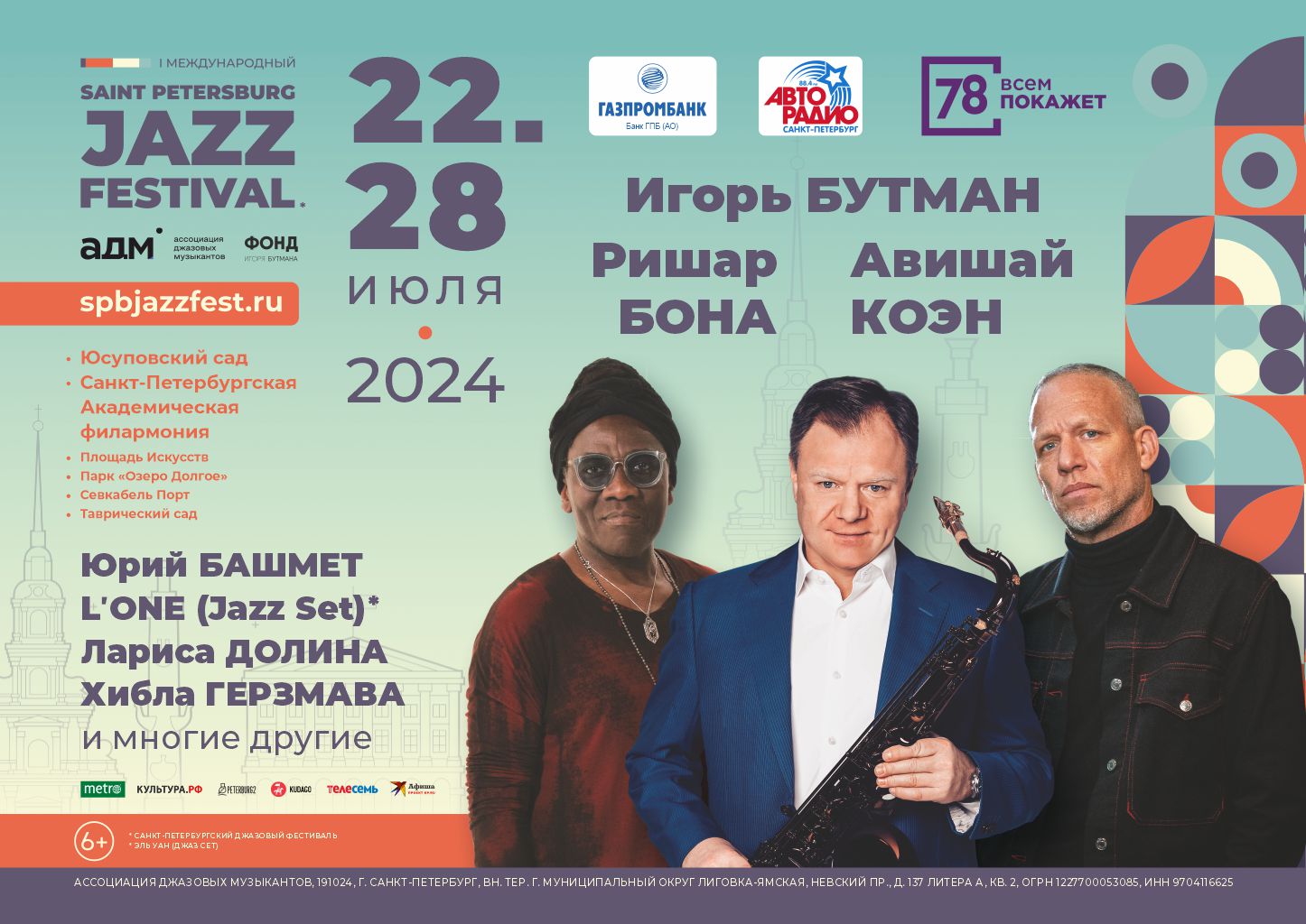 Первый Санкт-Петербургский международный джазовый фестиваль соберет более 600 музыкантов из России и зарубежья, представленного Турцией, Кубой, Индонезией, Таиландом, Узбекистаном. Концерты открытия и закрытия состоятся в Большом зале филармонии: 22 июля выступят инициатор фестиваля Игорь Бутман, Юрий Башмет и его оркестр «Солисты Москвы», 28-го – Хибла Герзмава, Московский джазовый оркестр Игоря Бутмана и ансамбль Давида Голощекина.