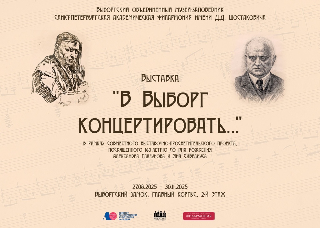 Выставка организована в Главном корпусе Выборгского замка Санкт-Петербургской филармонией и Выборгским музеем-заповедником, представивших экспонаты из своих фондов. В числе особо ценных – фотопортрет Александра Глазунова 1920-х годов с текстовым и нотным автографом композитора, бюст Яна Сибелиуса работы скульптора Мауно Ойттинена (1929), подаренный Обществом дружбы «СССР-Финляндия» Заслуженному коллективу Республики в 1946 году во время его первых зарубежных гастролей, и памятная медаль, отчеканенная к 50-летию Сибелиуса. Кроме того, на выставке экспонируются копии фотографий из мемориальной коллекции Глазунова в собрании Санкт-Петербургского музея театрального и музыкального искусства, а также предметы из частных коллекций.