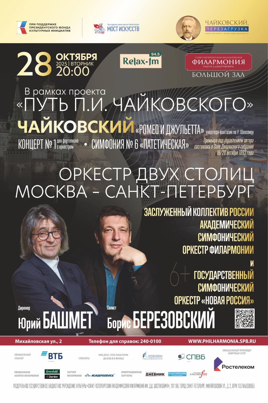 Проект, представляющий собой музыкальное путешествие по местам, где композитор находил вдохновение для творчества, стартовал в 2022 году, а завершится 28 октября этого года концертом в Большом зале Санкт-Петербургской филармонии. Программу представит «Оркестр двух столиц», объединяющий музыкантов «Новой России» и Заслуженного коллектива России (впервые его выступление состоялось в январе 2024 года на Зимнем фестивале Юрия Башмета). Прозвучат три произведения Чайковского - увертюра-фантазия «Ромео и Джульетта», Первый фортепианный концерт с Борисом Березовским в качестве солиста и Симфония № 6 «Патетическая». 132 года назад в этот день (28 октября по новому стилю) и в этом же зале (тогда — зале Дворянского собрания) на премьере Шестой автор в последний раз появился перед публикой, встав за дирижерский пульт. Через девять дней Чайковского не стало.