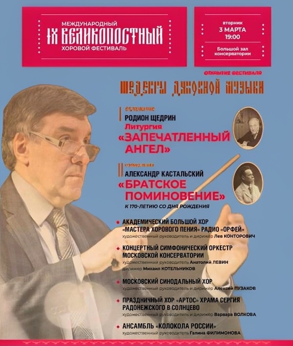 Откроется фестиваль исполнением в Большом зале Московской консерватории русской литургии «Запечатленный ангел» Родиона Щедрина и «Братским поминовением» Александра Кастальского (приуроченным к 170-летию со дня рождения композитора).